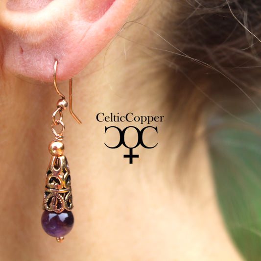 Copper Amethyst Earrings With Handmade Vintage Copper Cone Beads 8mm Natural Amethyst Bead Earrings