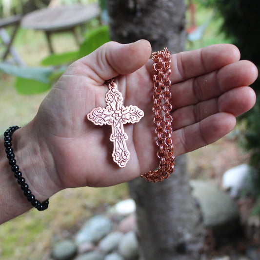 Copper Cross Necklace Large Embossed Pure Copper Cross Pendant 7mm Double Cable Chain Necklace