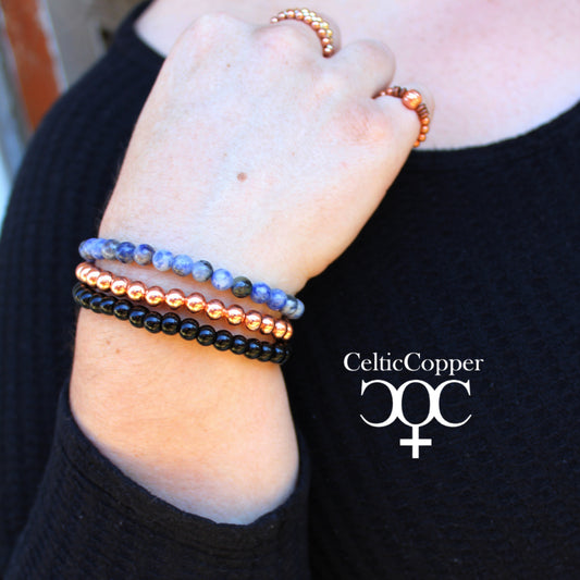 Blue Spot Jasper Copper Bracelet Set Round Beaded Elastic Black Agate Copper Bracelets 3 Piece Set