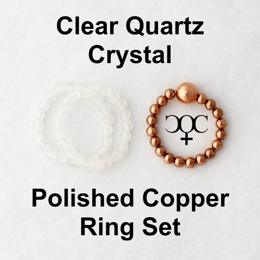 Beaded Copper Ring Set Pure Healing Copper Clear Quartz Crystal 3 Piece Beaded Elastic Ring Set