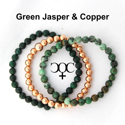 African Green Jasper Copper Bracelet Set Round Beaded Gemstone Elastic Copper Bracelets 3 Piece Set