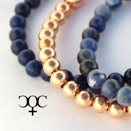 Lapis Lazuli Copper Bracelet Set Round Beaded Elastic Midnight Blue Copper Bracelets 3 Piece Set