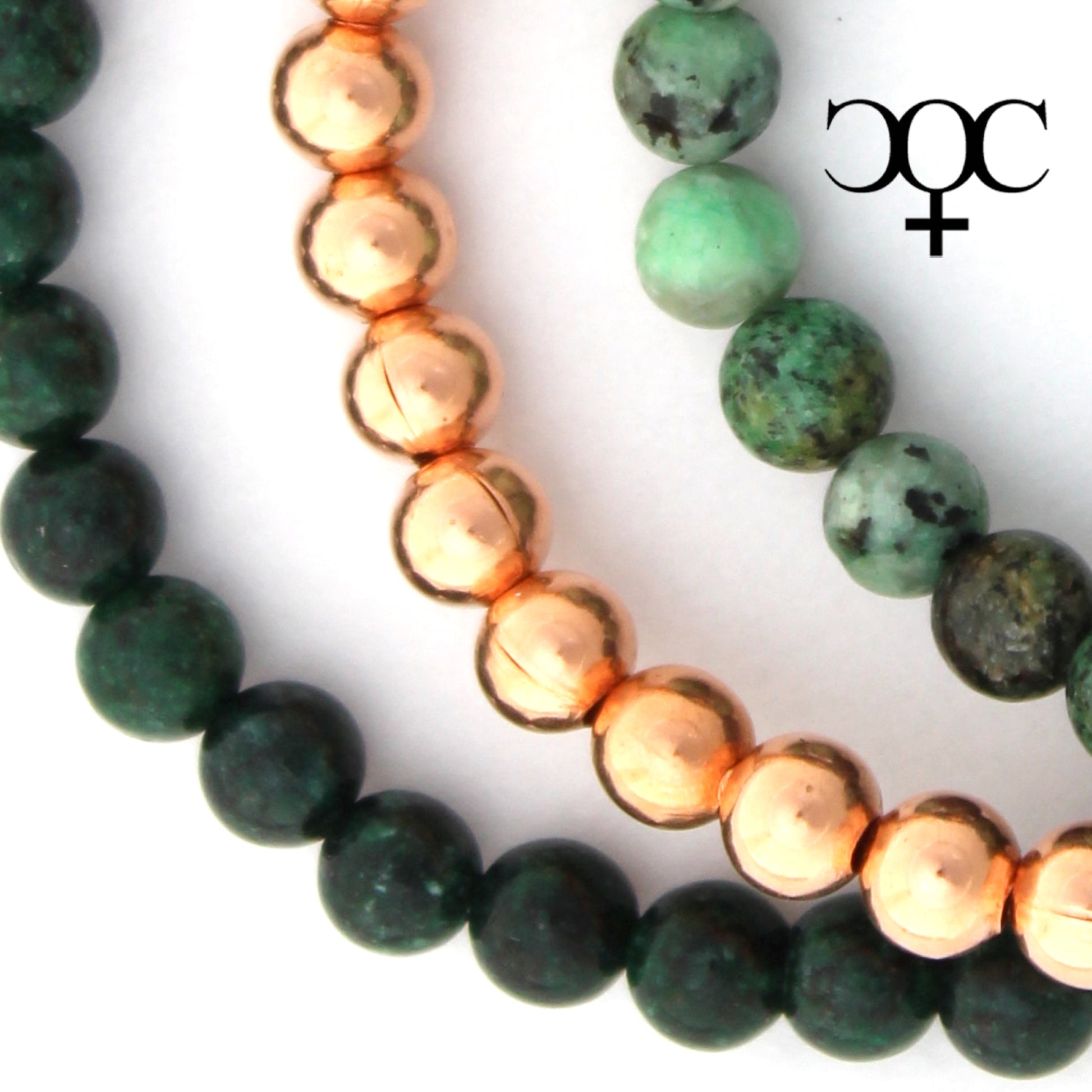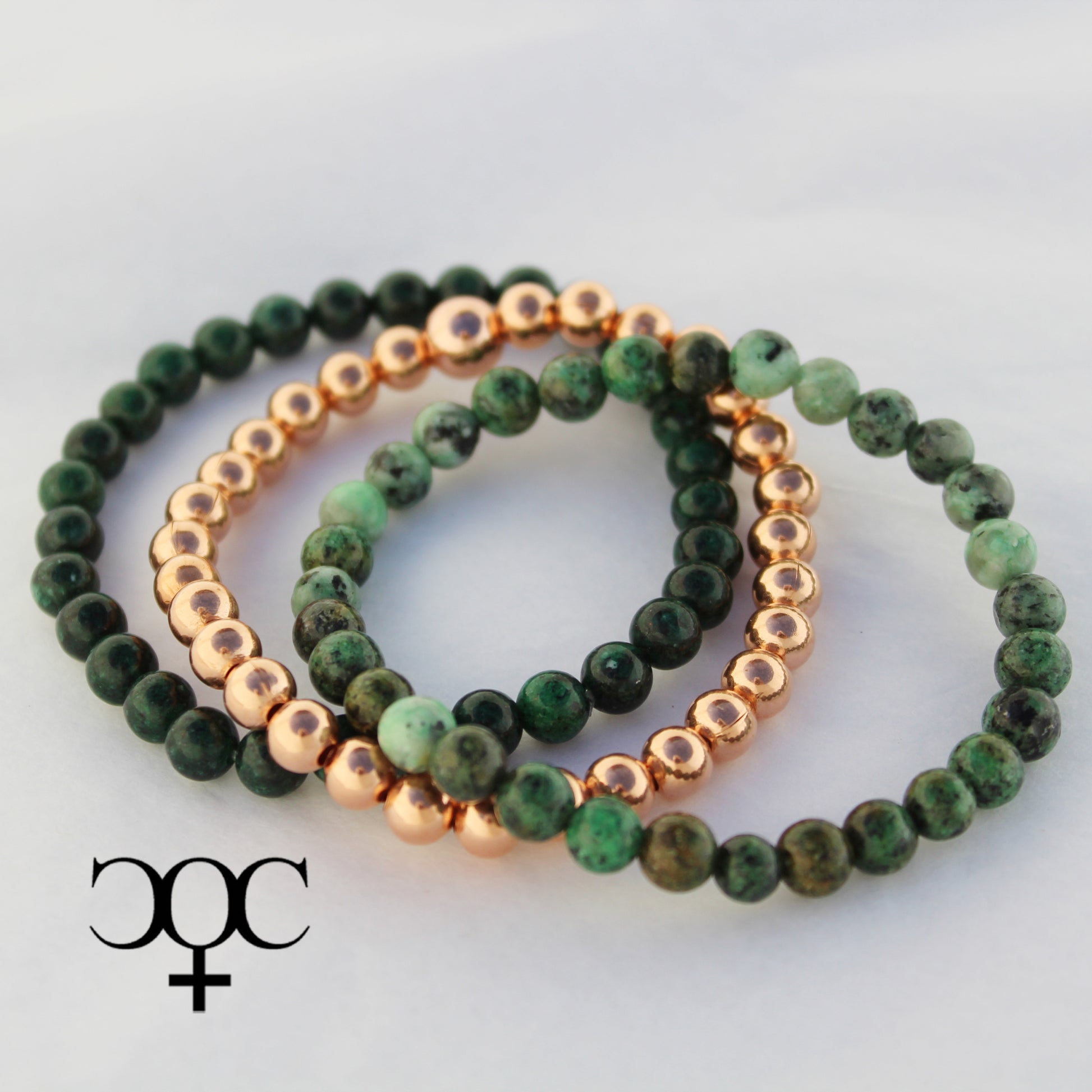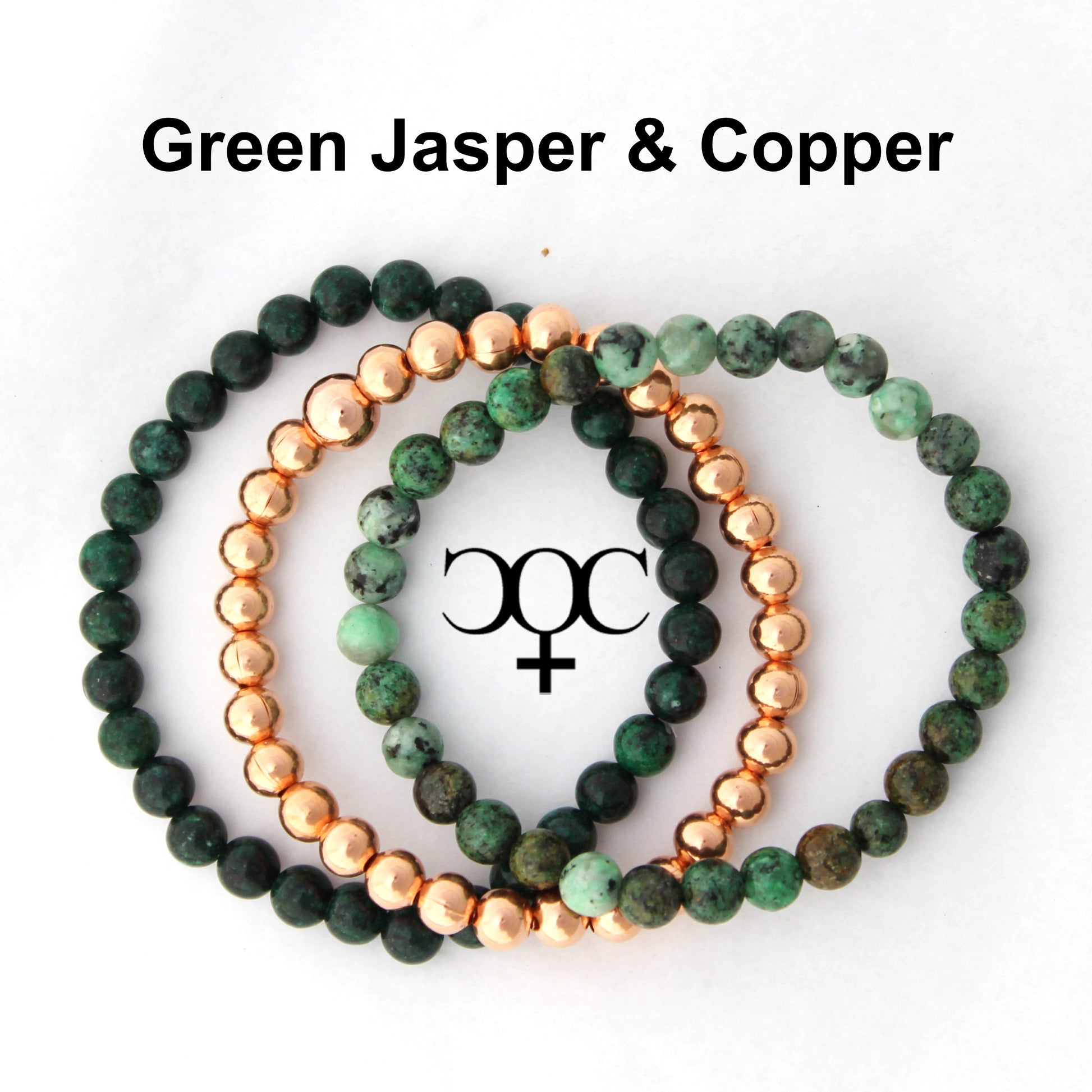 The deep varied greens of African Jasper compliment the warm luster of copper in this 3-piece bracelet combo. The set includes one pure copper stretch bracelet and two natural gemstone bracelets.
