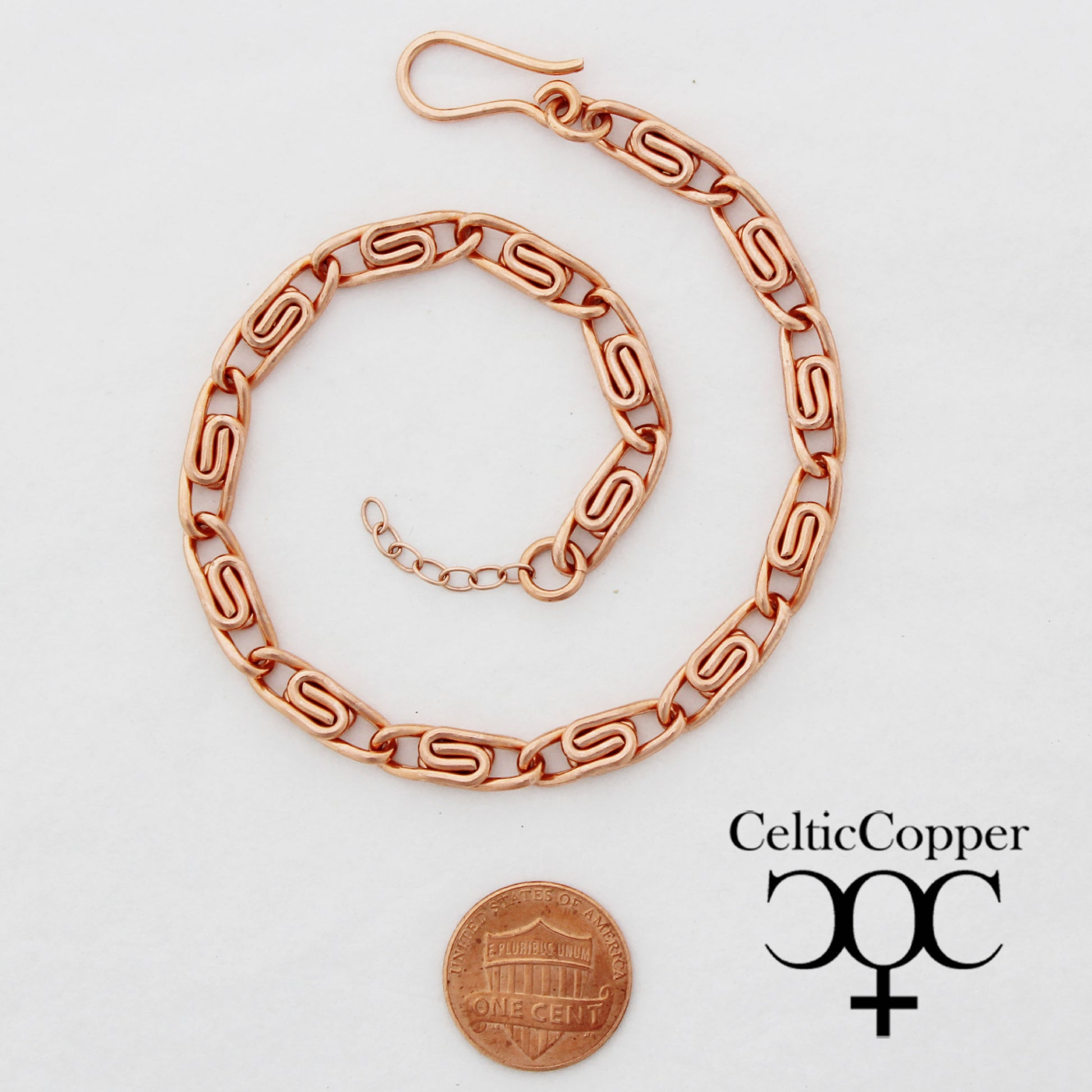 Each link of the Celtic scroll chain is made with two interlocking pieces of solid copper. No solder is used to keep the scroll links together, only pressure and precision polish. The result is smooth, oval link chain with a low profile that is both classically Celtic and universally casual.