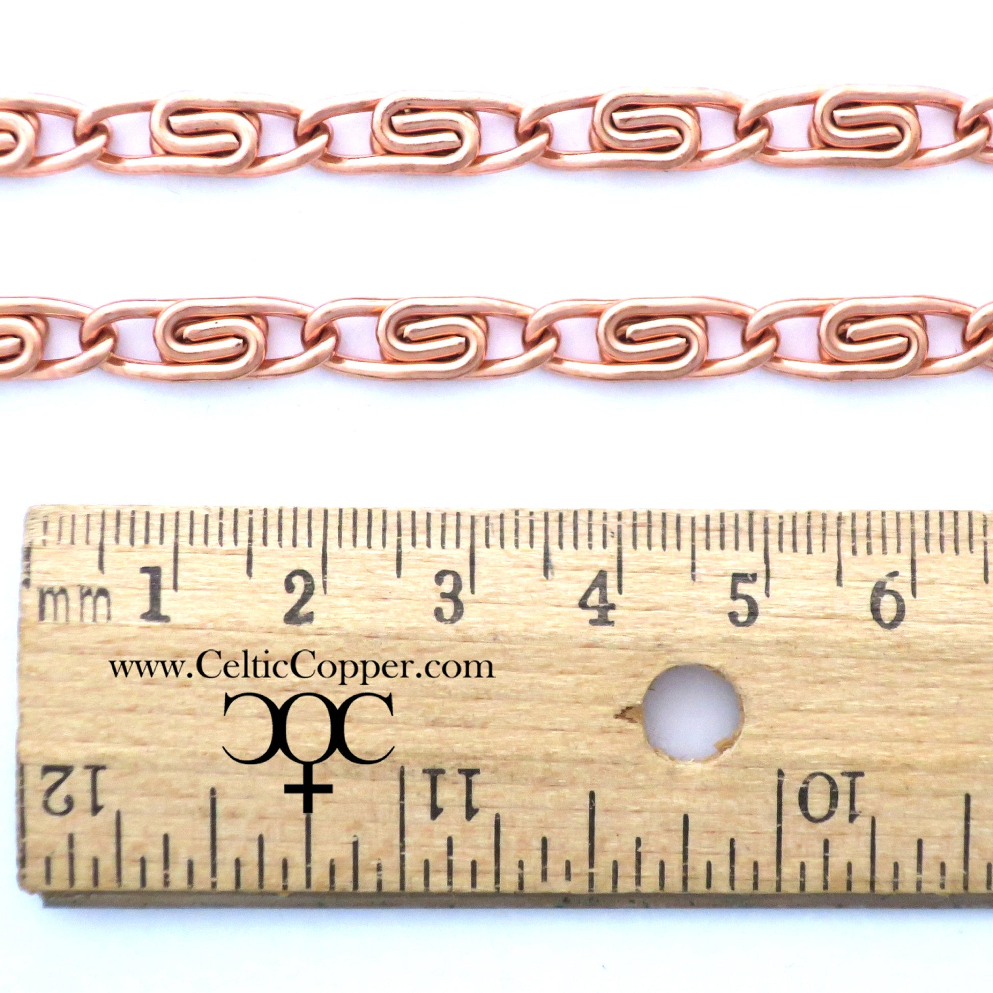 The pure copper scroll style necklace has an interesting look reminiscent of Celtic knot work designs. Each link is made of two interlocking pieces of solid copper to create an oval link that measures a half an inch long by a quarter of an inch wide (15x5mm).