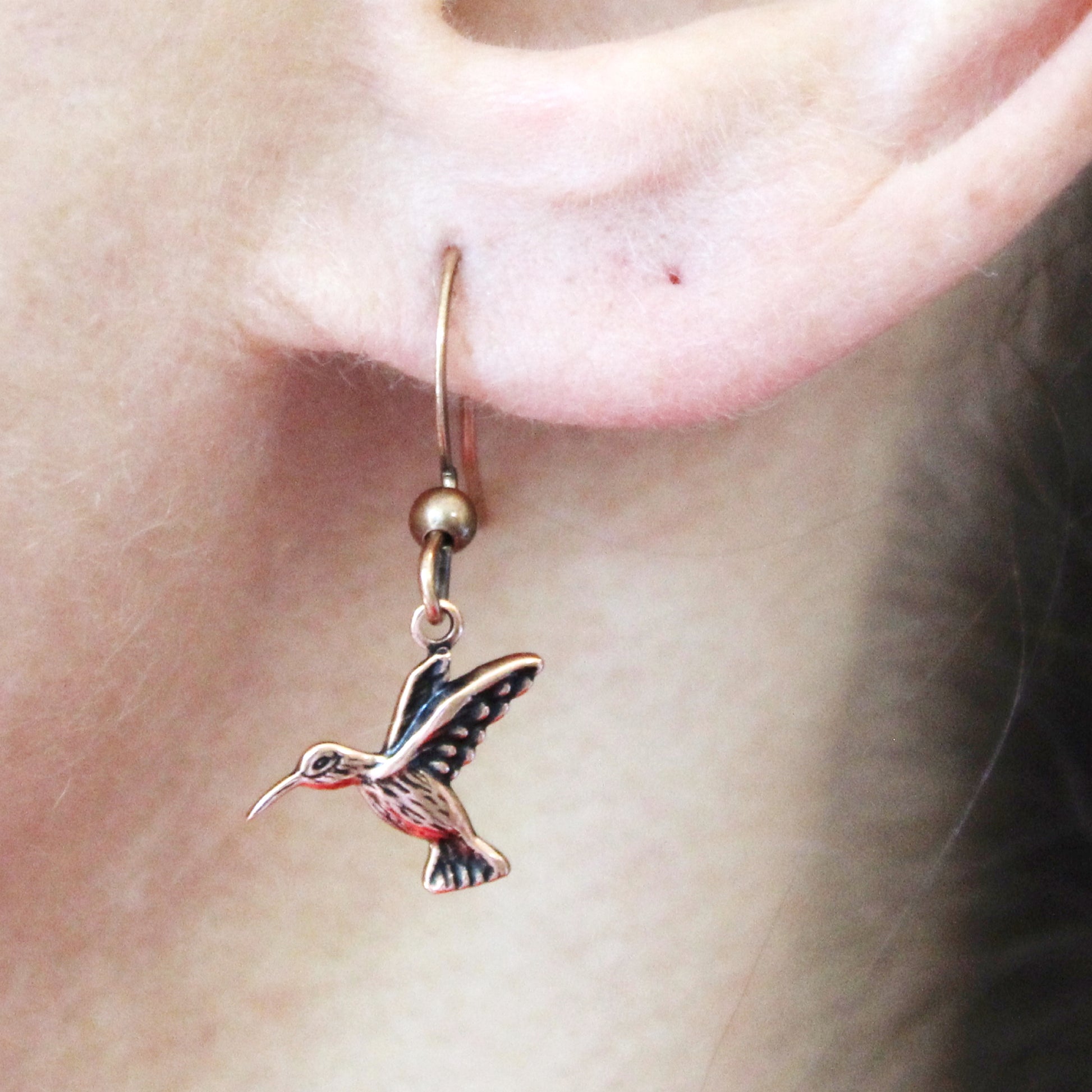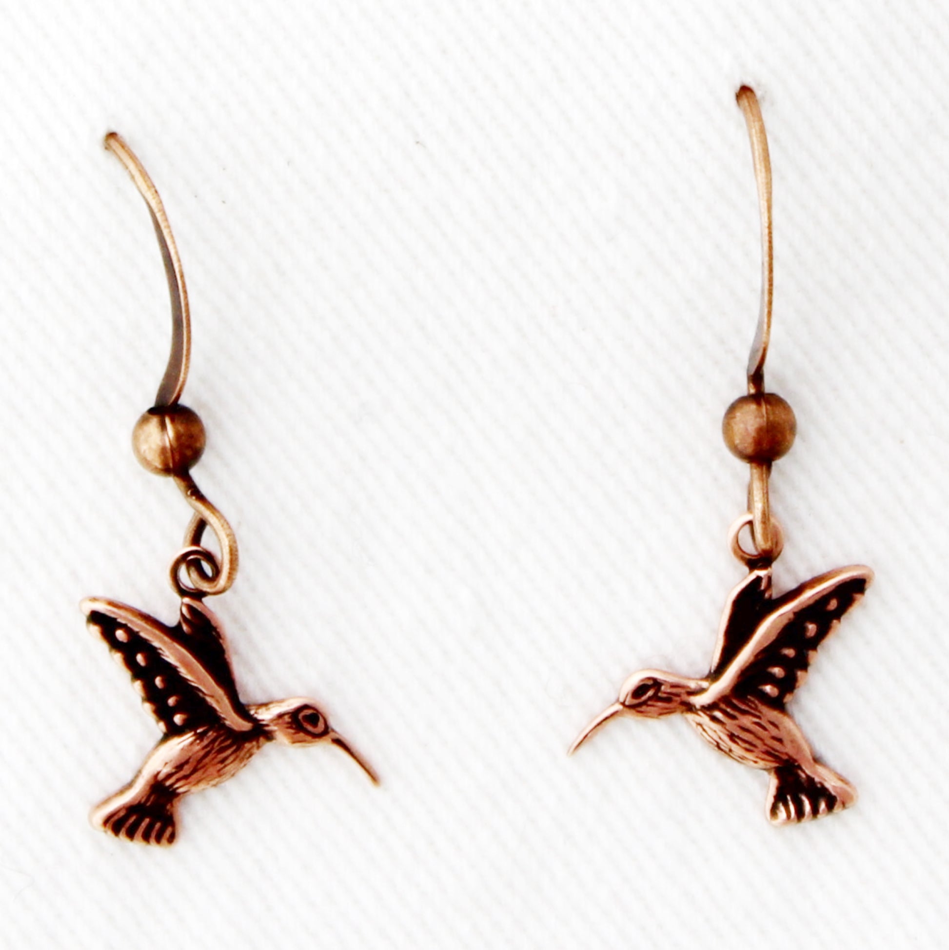 Nature Lovers adore Hummingbirds. Our little matching Hummingbirds have all the charm and detail they need to delight the heart with their realistic copper silhouettes. The small delicate hummingbird charms hang from the earring style of your choice.