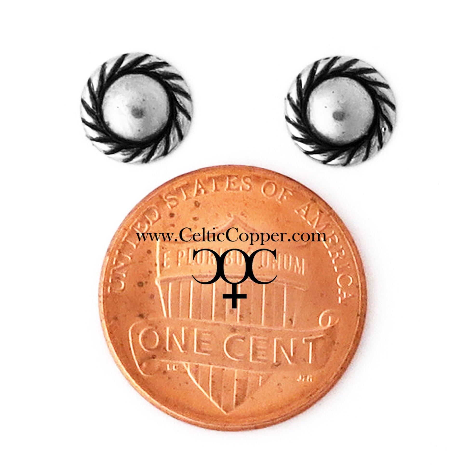 Light, comfortable 8mm Silver Rope Edged Stud Earrings feature a shiny round center dome accented by a decorative rope style edging. Made in America from solid Sterling Silver and hypoallergenic surgical steel posts and clutches.
