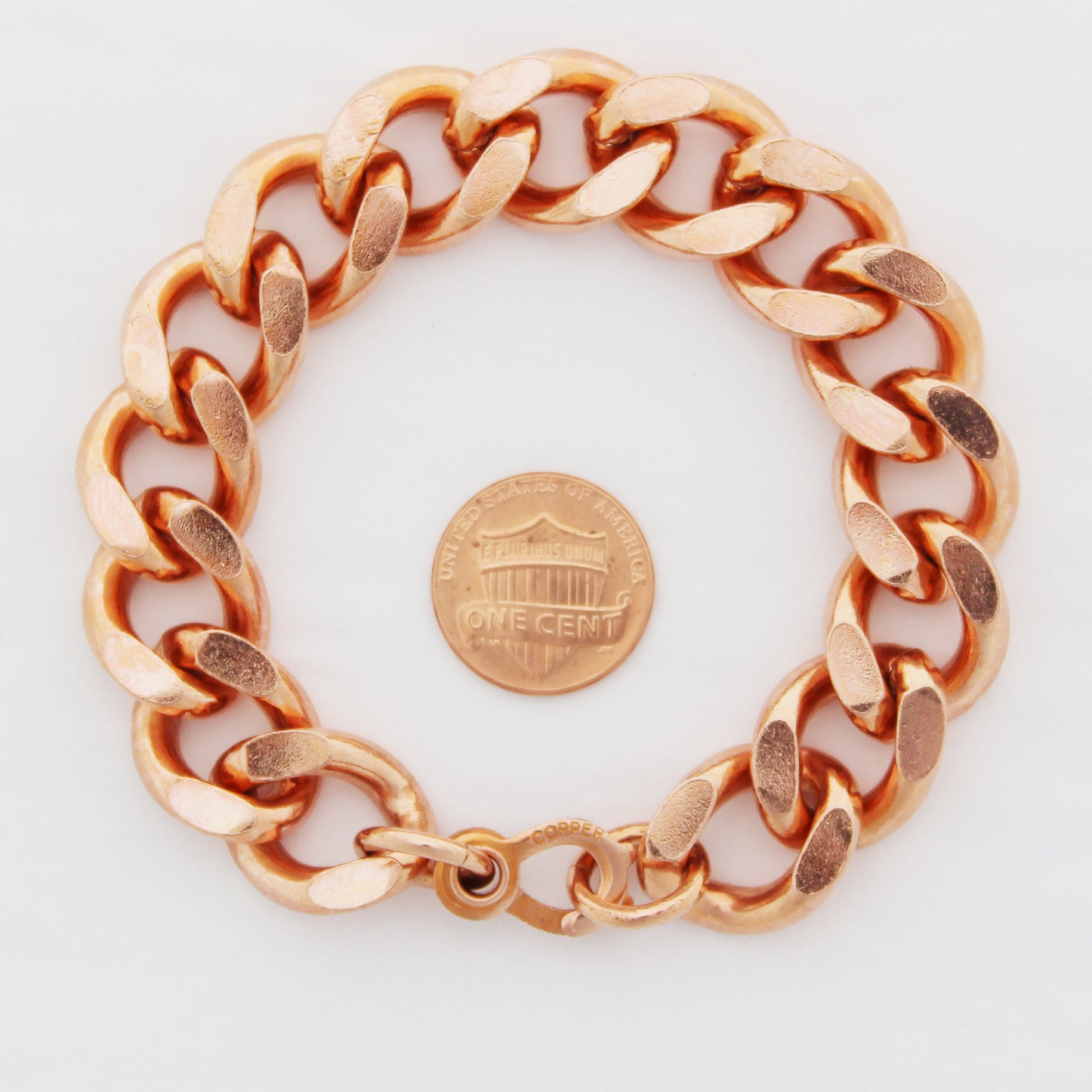Meet the hunkiest, chunkiest curb chain in our solid copper collection. The bevel-top Cuban curb link chain is made with copper wire over 4mm thick and measures a phat 16mm across. All parts of this handsome bracelet are made in America of pure solid copper.