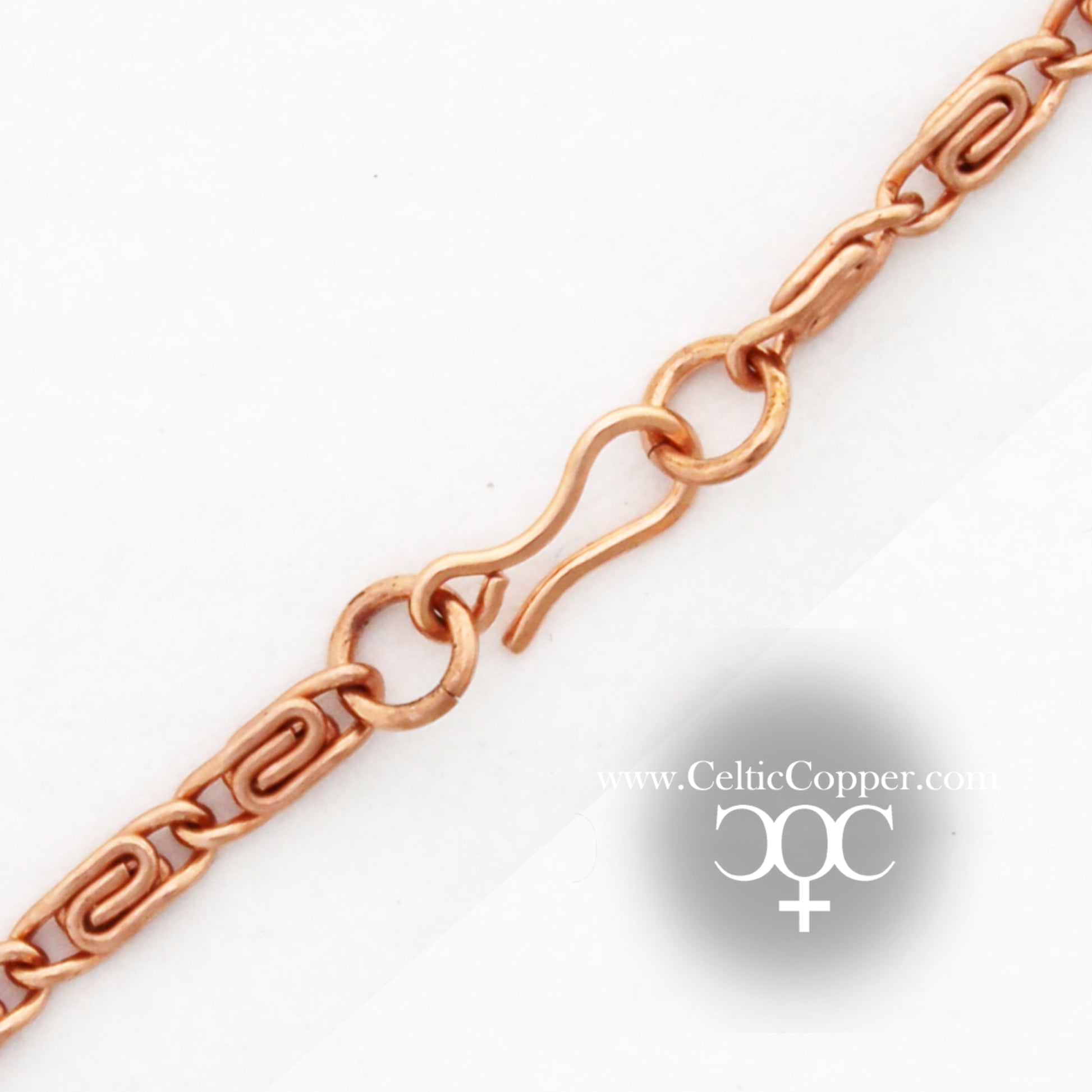 This specialty chain is made completely of pure solid copper. The tiny unsoldered interlocking links of the fine scroll chain have a delicate decorative distinction from others chains. This is the lightest weight of the three solid copper scroll chains offered by Celtic Copper.