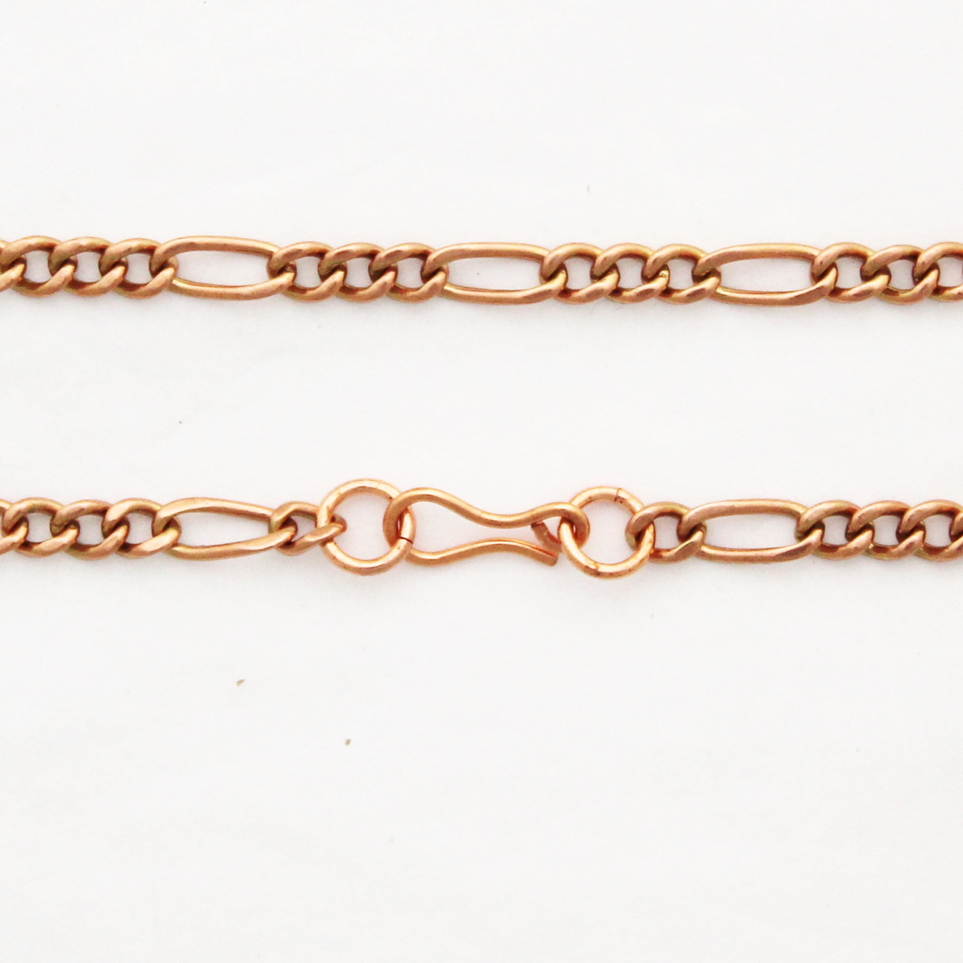 Figaro chain is distinctive to Italian design. Our copper Figaro chain is an attractive weight that is both strong and light. The width of the chain measures one-eighth of an inch (4mm) and each chain link is soldered closed. The Figaro chain is our only soldered link copper chain style.