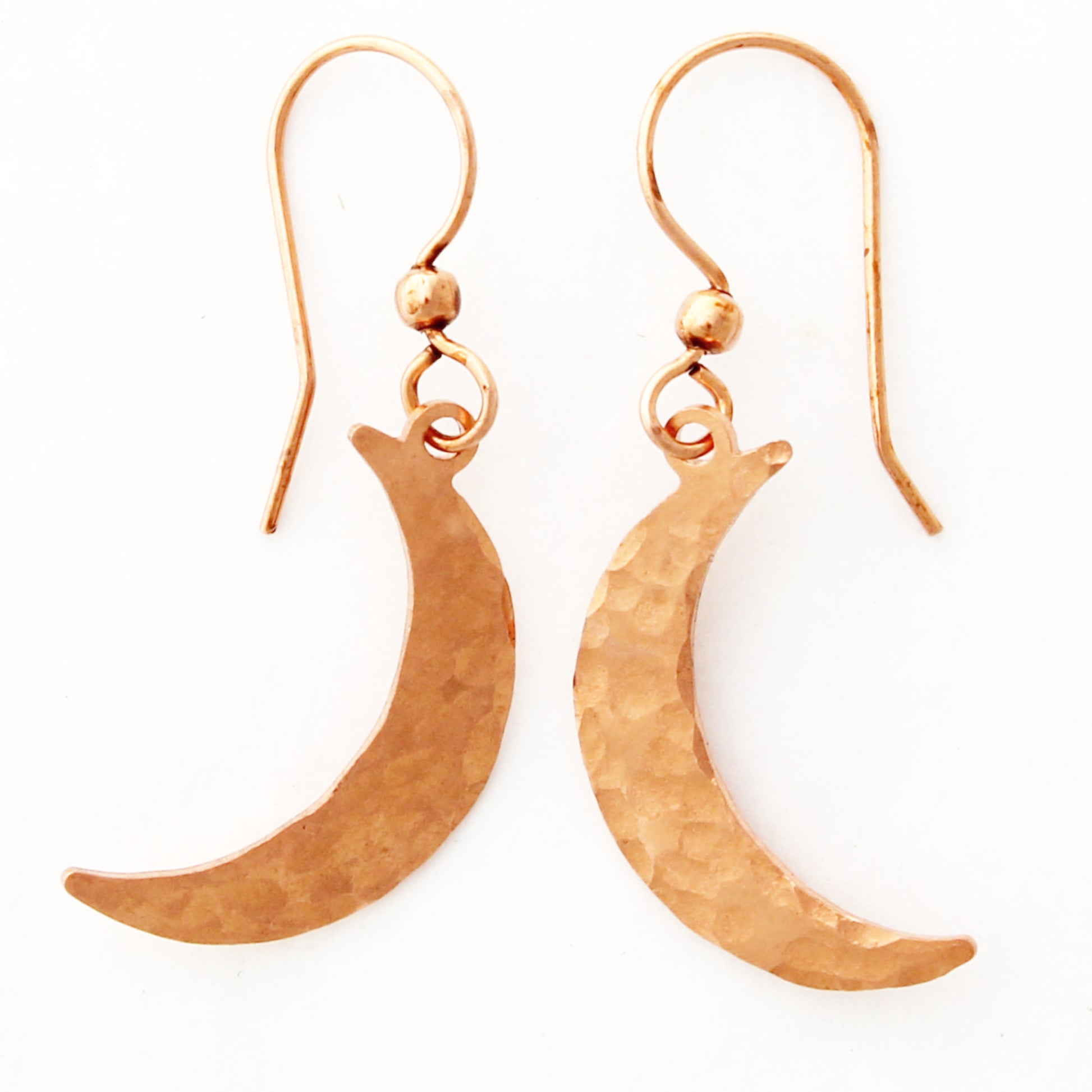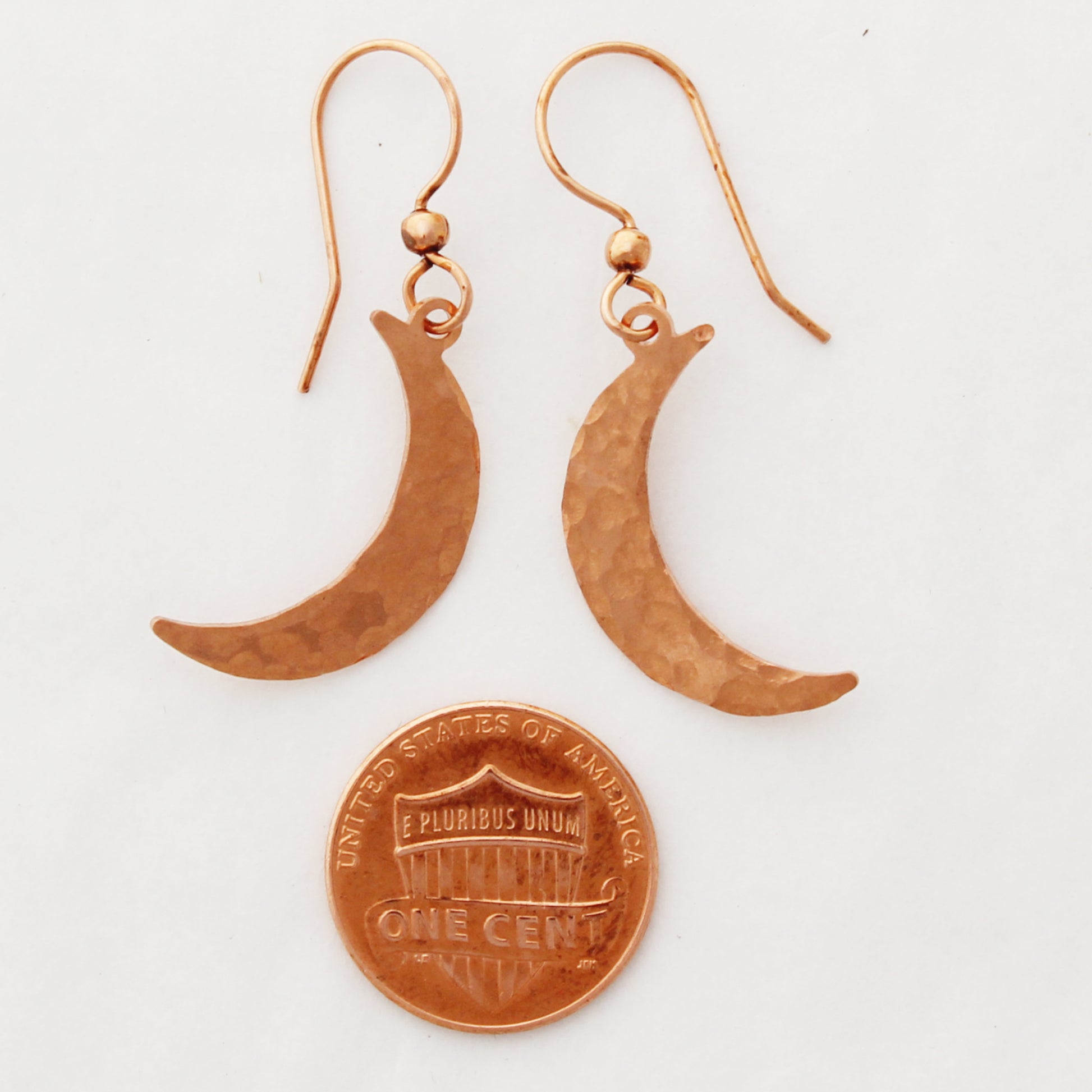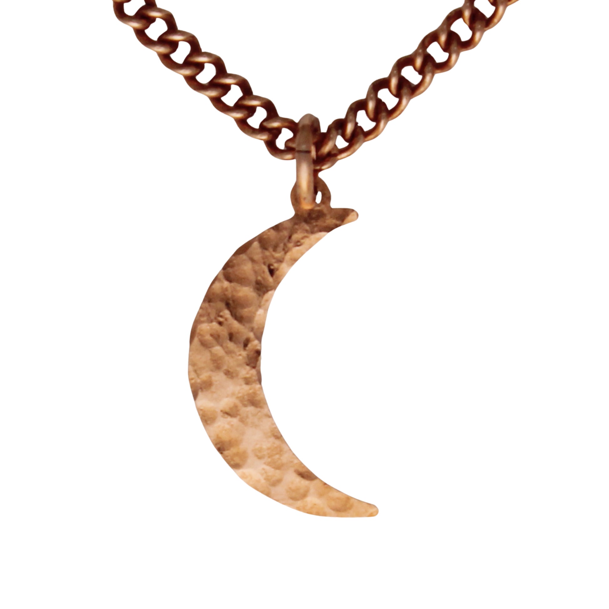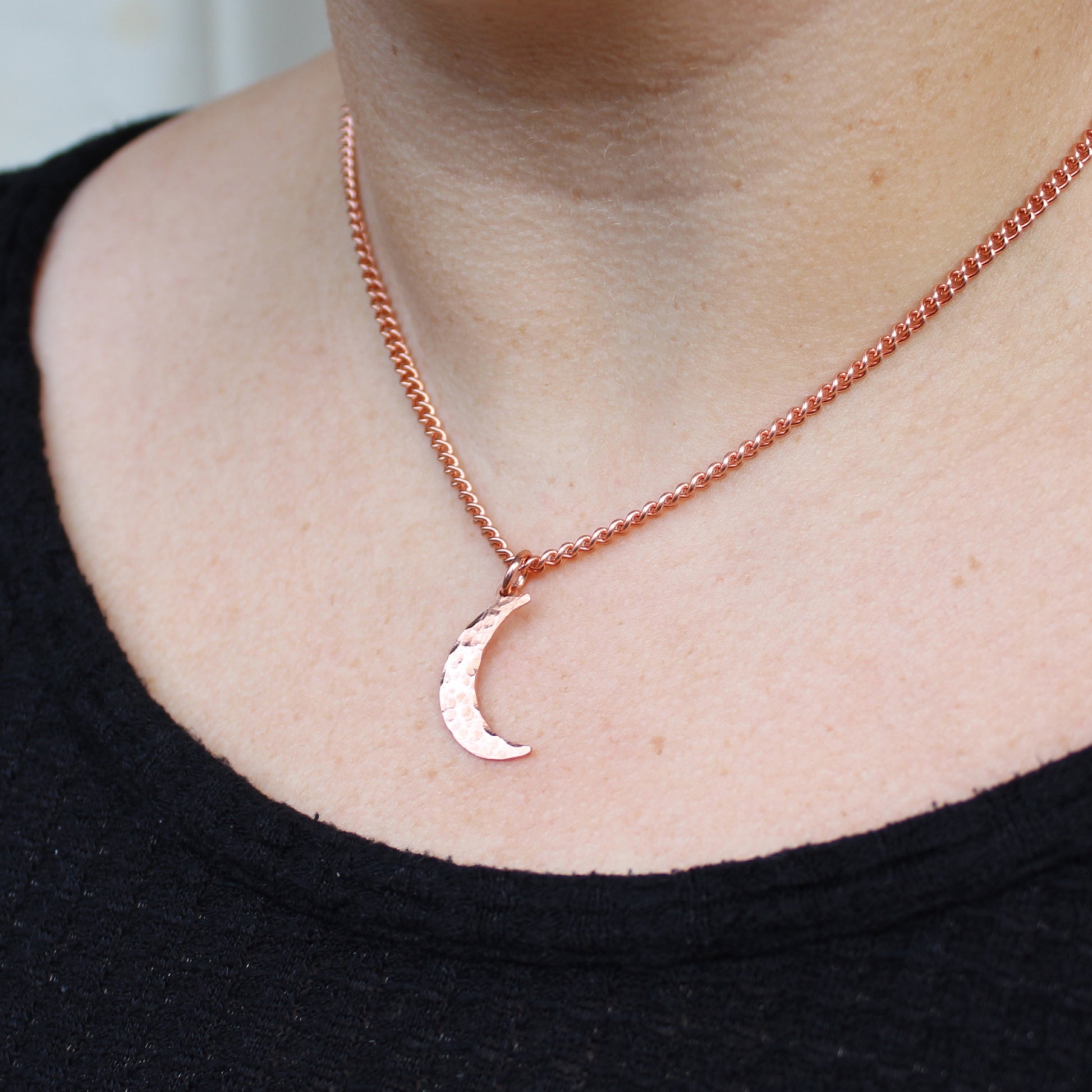Stamped from solid copper the hammered moon charm hangs from a fine 3mm solid copper curb chain necklace adjustable from 17-19-inches. Necklace can be worn long or short. The matching Earrings have a choice of findings.