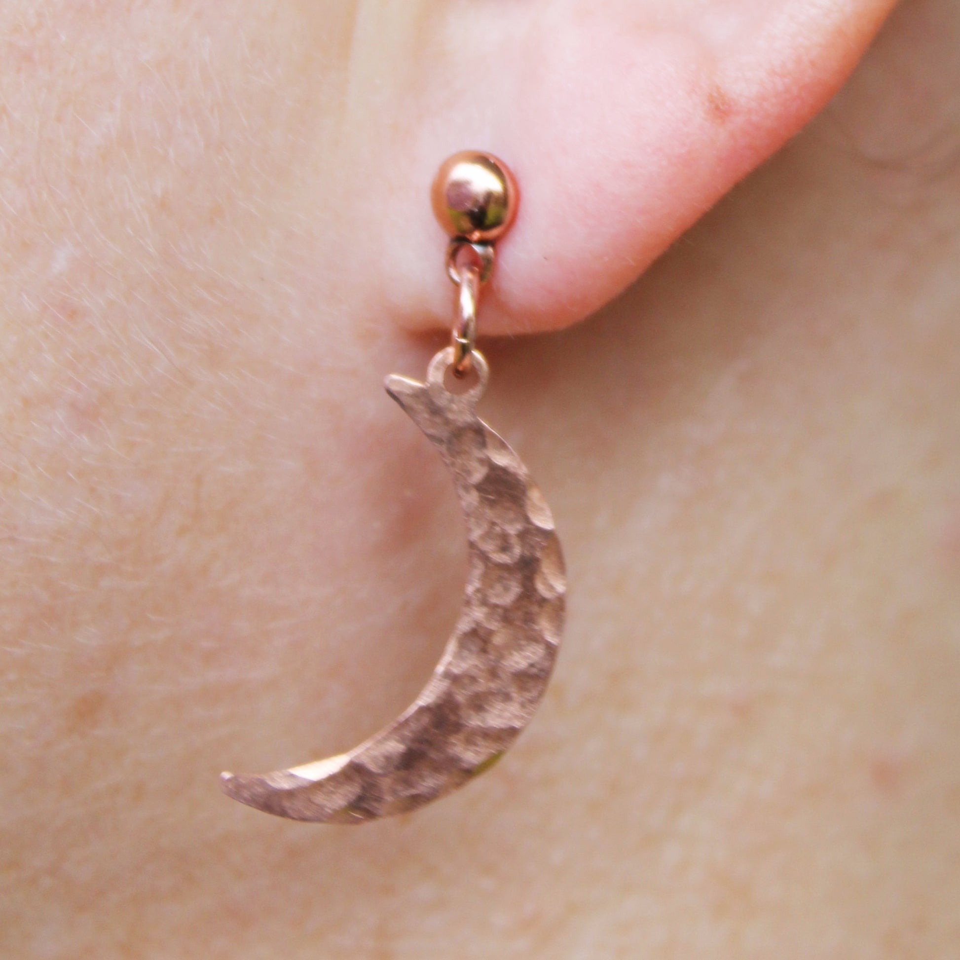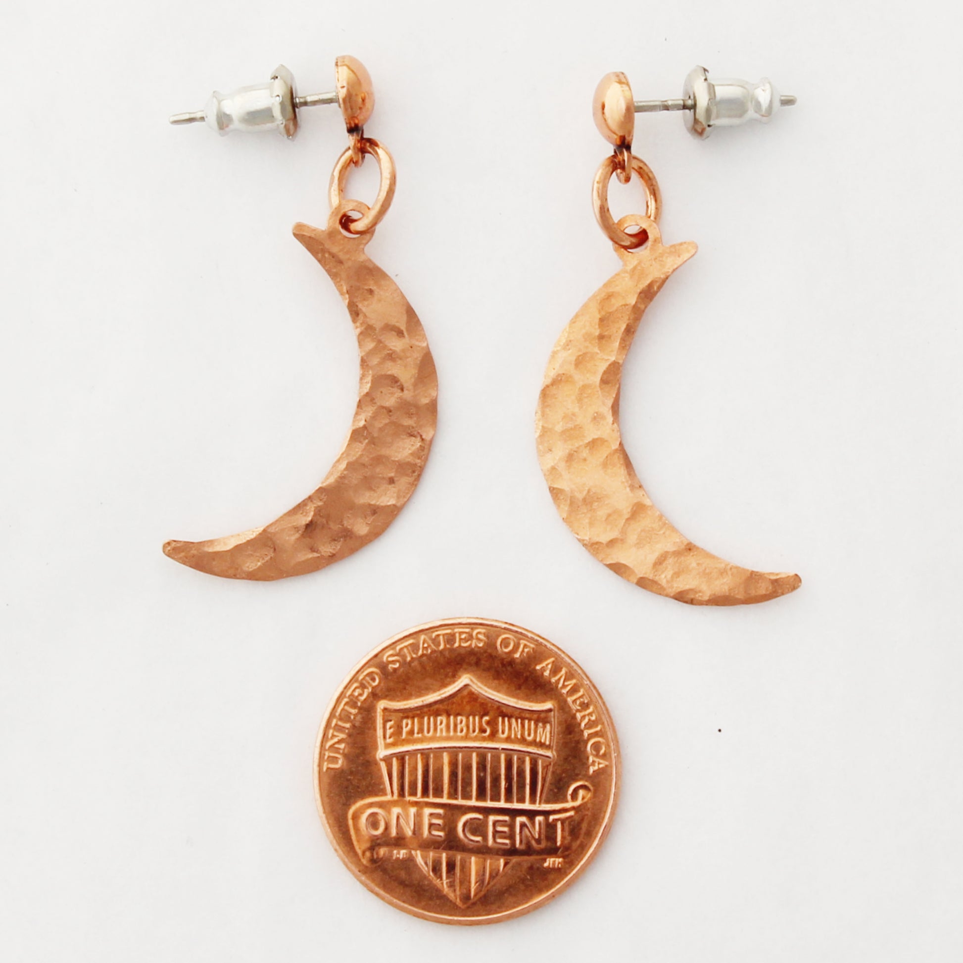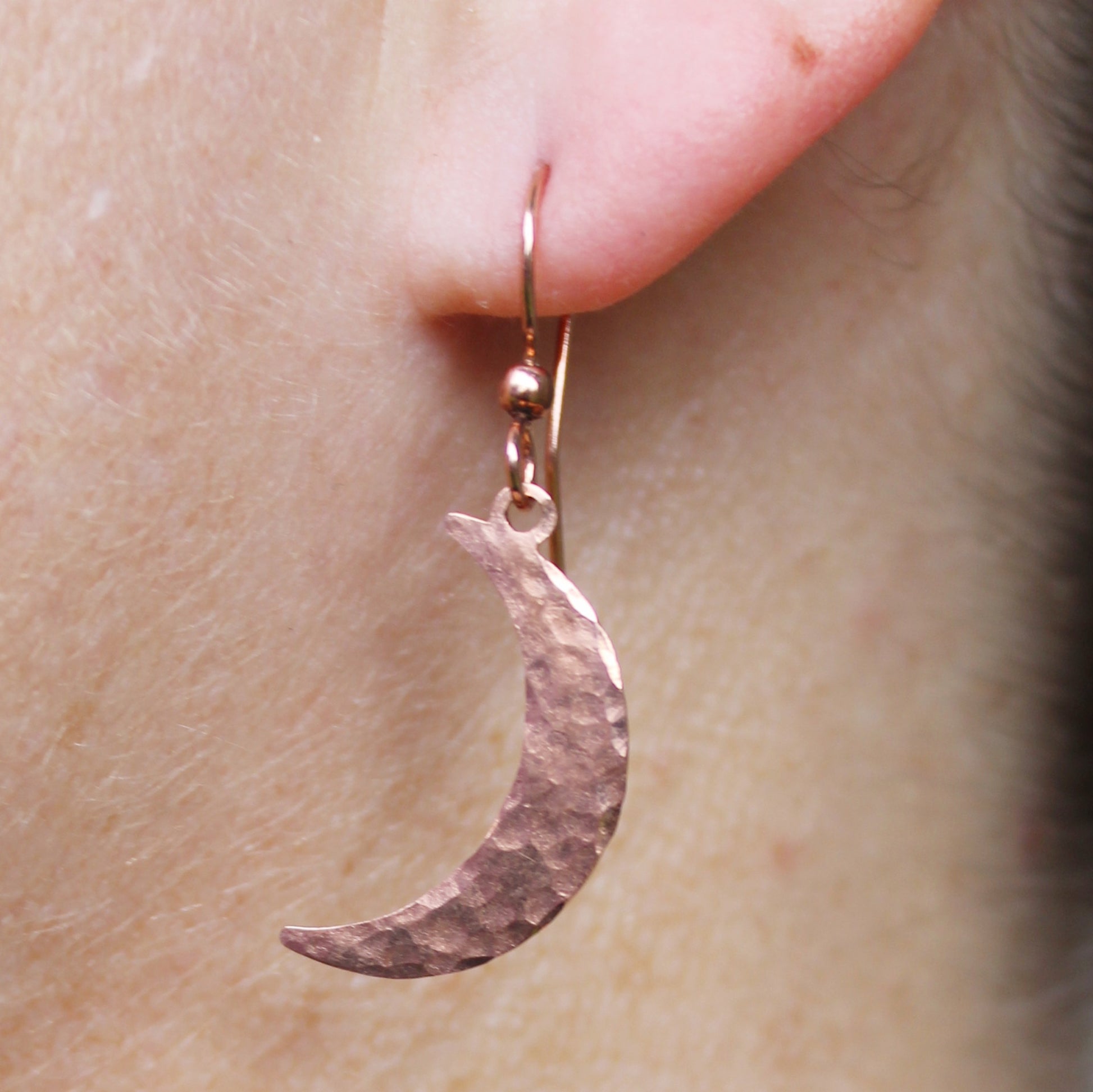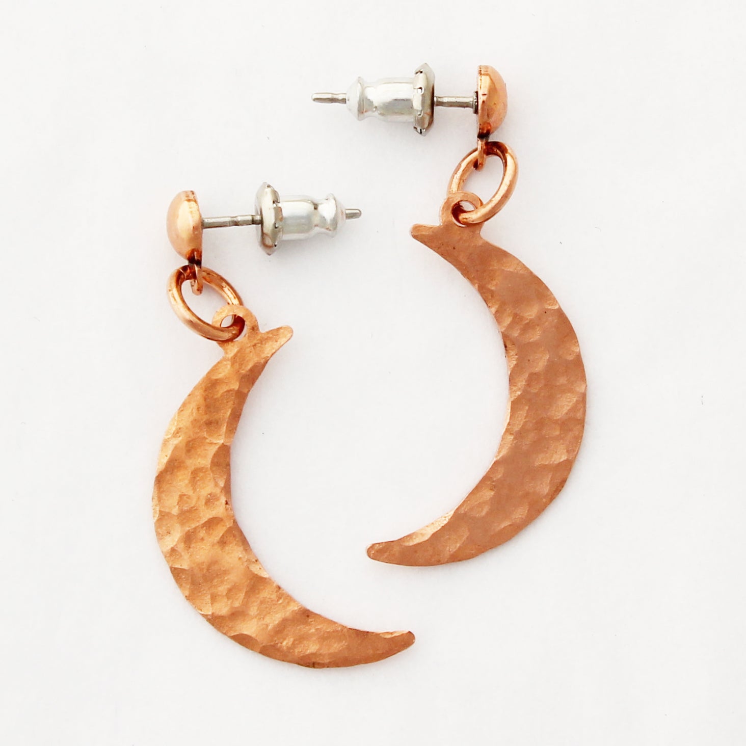Stamped from solid copper the hammered moon charm hangs from a fine 3mm solid copper curb chain necklace adjustable from 17-19-inches. Necklace can be worn long or short. The matching Earrings have a choice of findings.