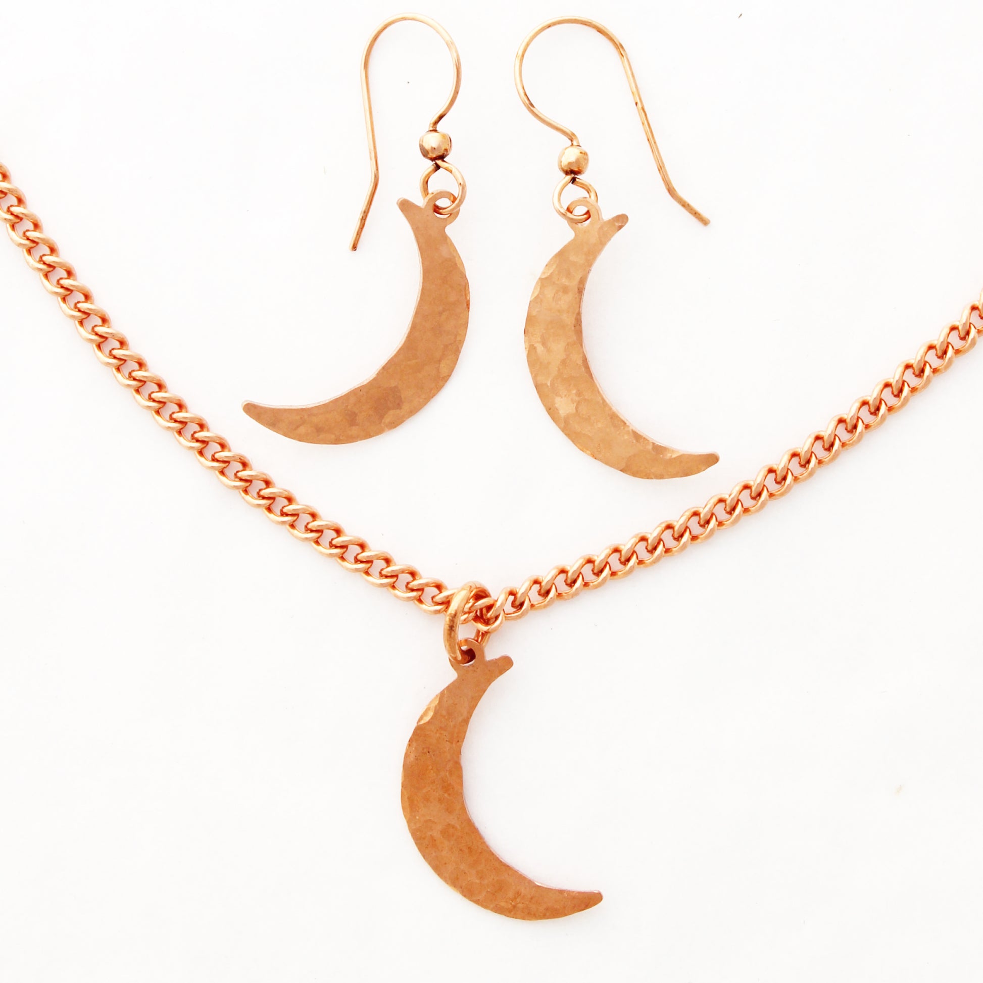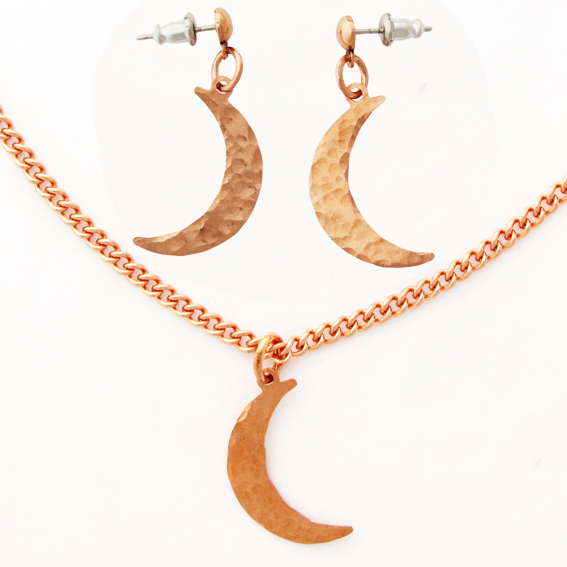 Luna Crescent Moon Copper Necklace Set Solid Copper Hammered Moon Pendant Chain Matching Earrings