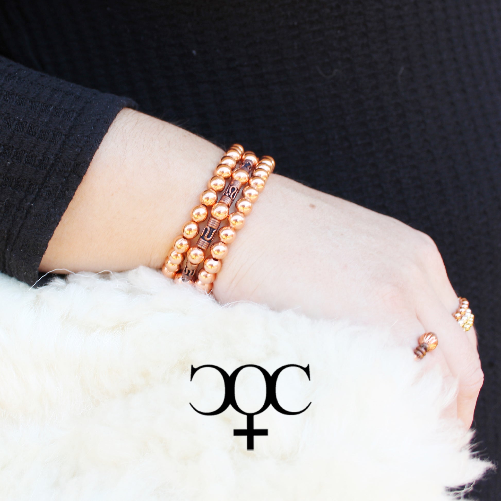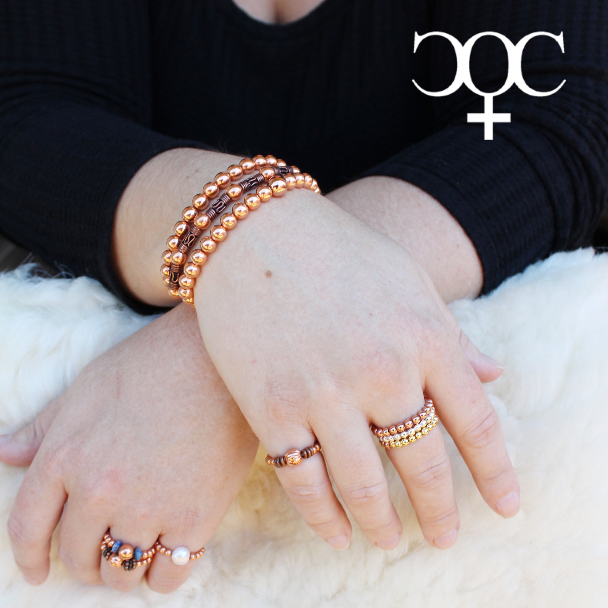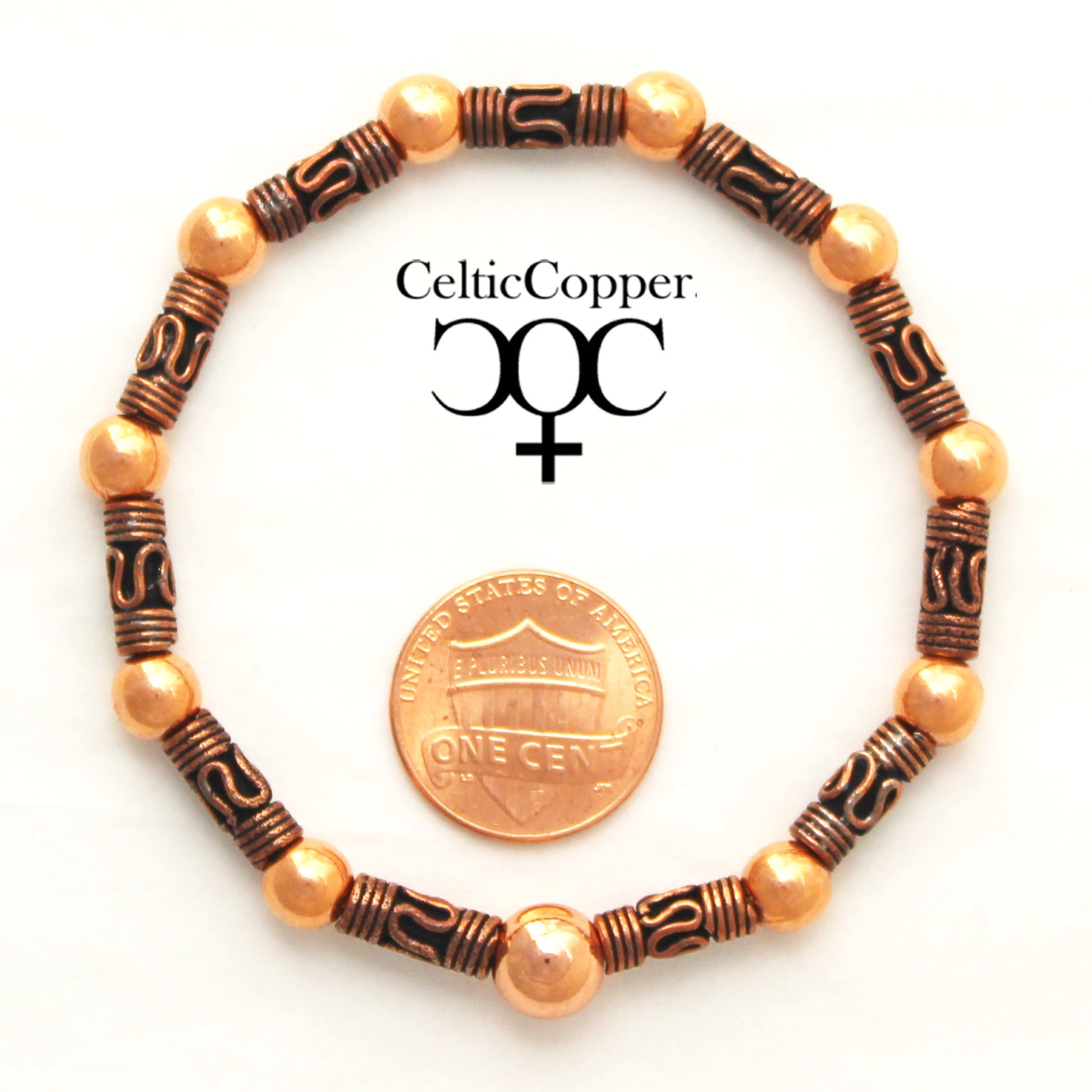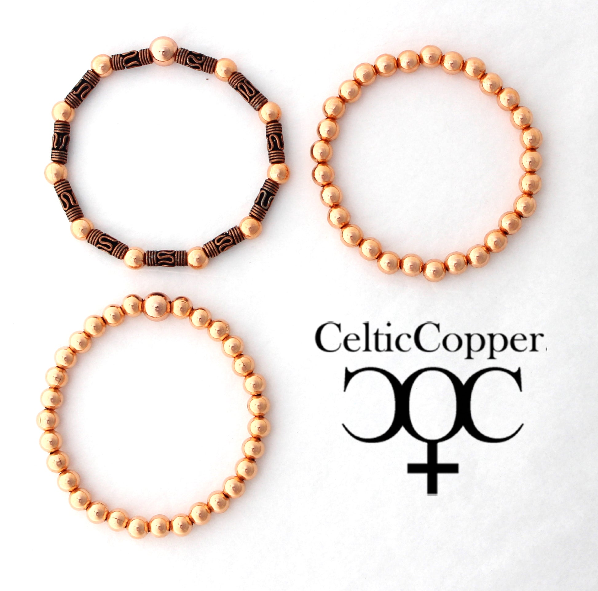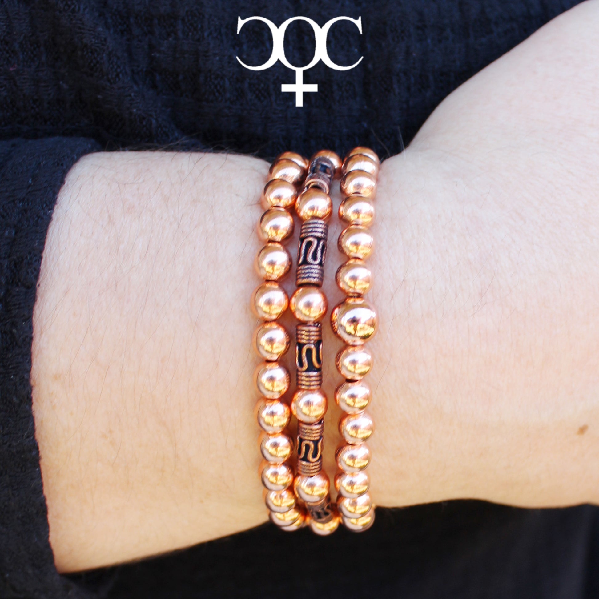 3 great bracelets, one great price! Get the benefits of wearing copper jewelry with a bracelet set that's easy to take on and off. Antiqued vintage beads from India along side 6mm round American made beads give this set of pure copper beaded bracelets an elegant intriguing look.
